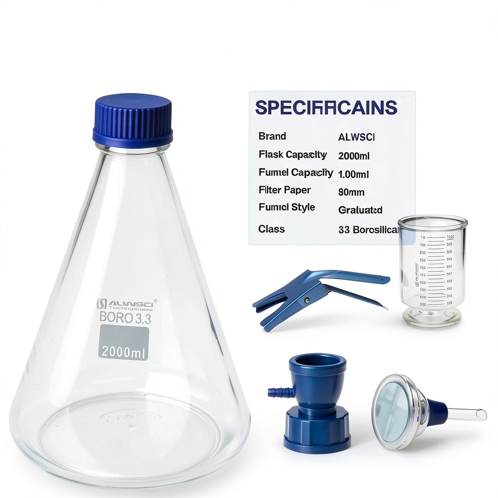 The ALWSCI glass vacuum filtration kit is engineered for precision and durability in laboratory settings. Constructed from borosilicate glass, the filter holder and flask deliver superior chemical resistance, uniform wall thickness, and a conical shape that supports heating, stirring, and shaking applications. The kit comprises a 1000 mL graduated funnel, a 2000 mL filtration bottle, a GL45 filtration adapter made from PP material with a PTFE O-ring for excellent corrosion resistance, a sturdy aluminum clamp, and a GL45 solid screw cap. Package dimensions are 17.7 x 17.3 x 12.75 inches, weighing 8.1 pounds, and it was first available on August 25, 2023. This assembly ensures reliable performance in demanding environments, from research labs to industrial processes.