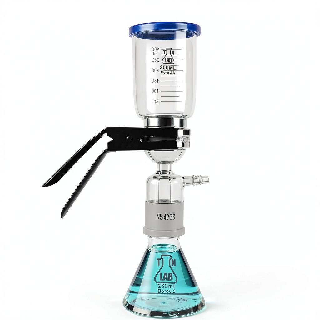 The TN LAB Supply Filter Flask Apparatus features a 250ml borosilicate glass construction with a three-part assembly and metal clamp, designed for fast and easy filtering in laboratory and educational settings. Its heavy-wall glass flask and 300ml glass frit Buchner funnel provide reliable performance for a range of scientific experiments and procedures. This apparatus is perfect for chemistry labs, research facilities, and classroom demonstrations, ensuring precise and efficient filtration every time.